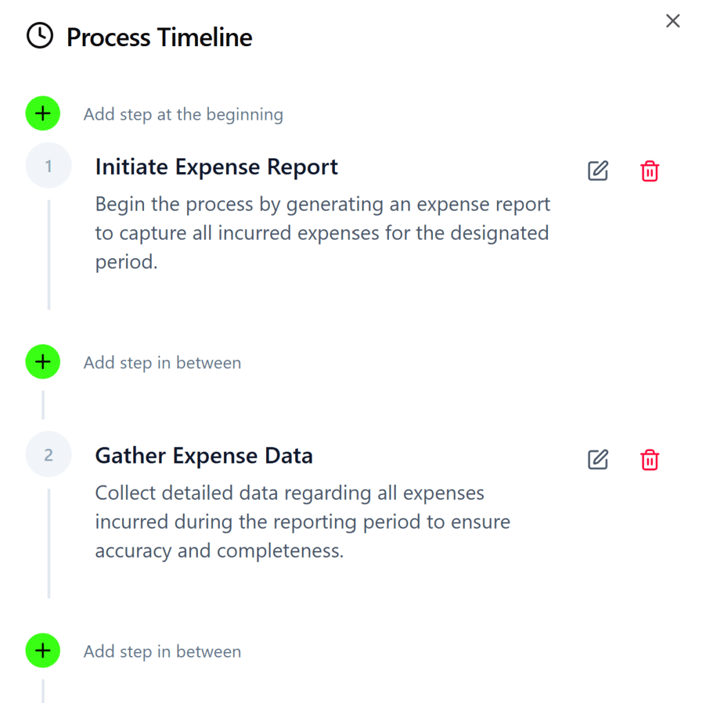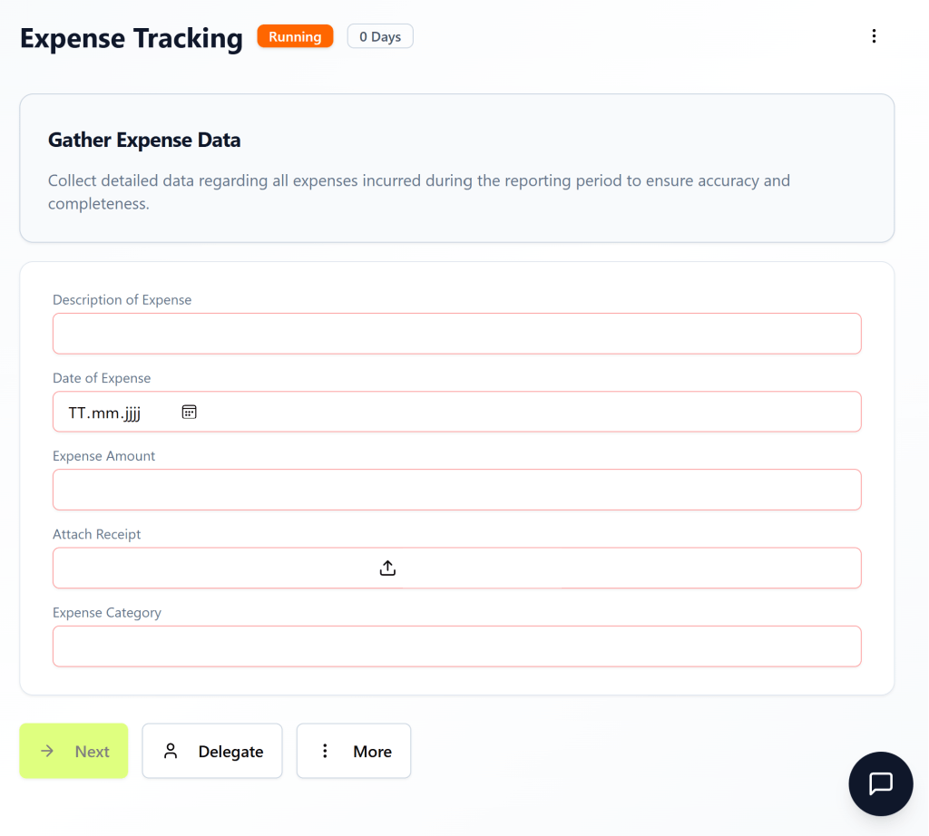 Use custom forms with checkboxes, text inputs, text editors with formatting, date selection, single and multiple selections, URLs including URL previews, file uploads, and downloads. Can be structured with headings. Fields from forms can be displayed again in subsequent steps as read-only or for editing. Editing can be enforced.